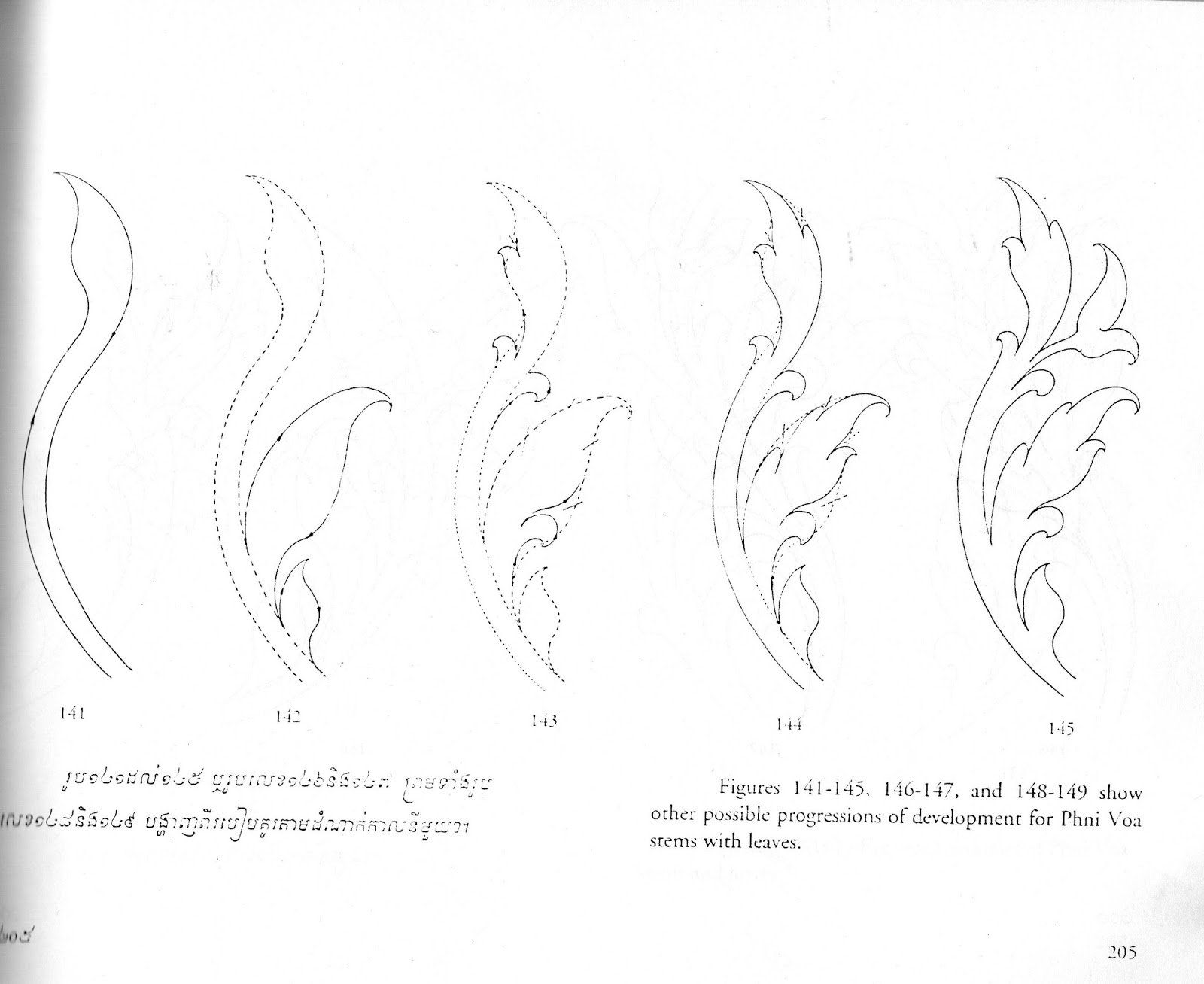 creepers. Buds and flowers, modelled on natural forms,are used interchangnbly in either Kbach Phni Tes orKbach Phni V011 compositions. hBuds and flowers in Phni Voa are drawn in the